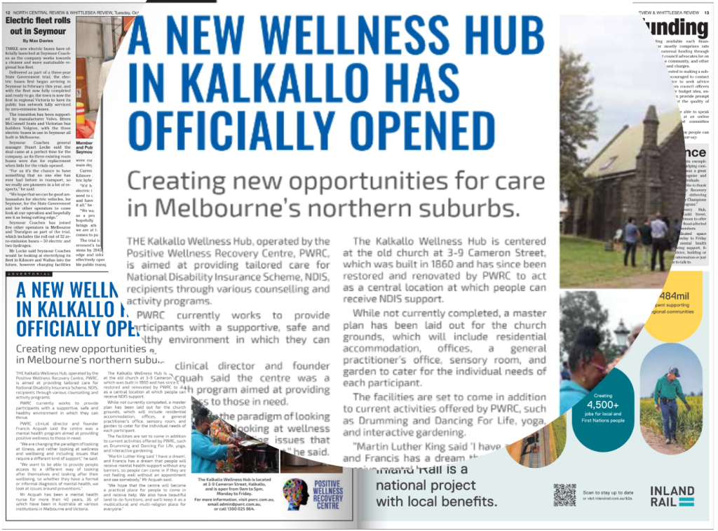 We are thrilled to share the exciting news that the Kalkallo Wellness Hub, operated by the Positive Wellness Recovery Centre (PWRC), has been featured in the prestigious Whittlesea Review. The article shines a spotlight on the official opening of this transformative wellness hub, creating new opportunities for care in Melbourne’s northern suburbs.